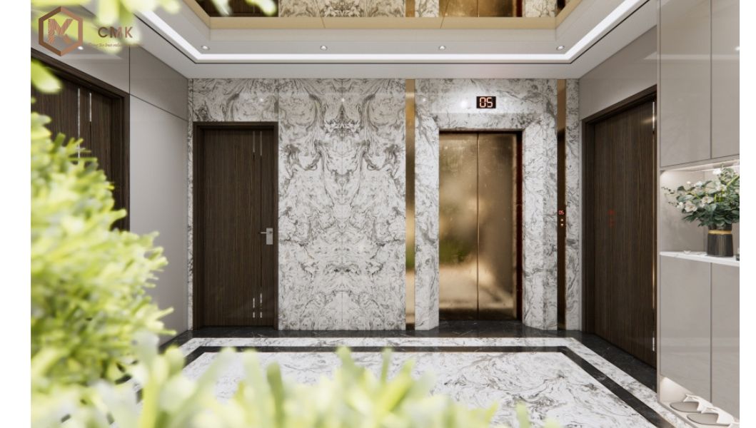 - Sảnh chính và khu vực tiếp khách: Tông màu trầm sang trọng kết hợp đá ốp cao cấp, trần thạch cao nghệ thuật và các chi tiết mạ vàng tạo nên cảm giác lộng lẫy, chuyên nghiệp.